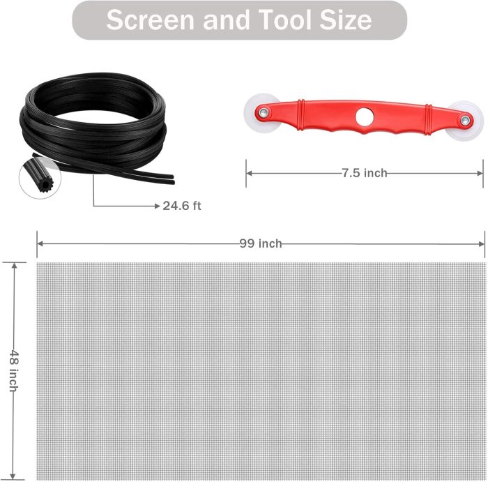 - Screen Replacement Kit: Window screen replacement kit comes with 48″ x 99″ screen, 2-in-1 rolling screen tool and 27.9ft screen retainer spline. It can be used as a new or replacement screen for window and door. It’s easy to replace the screen in a short time even if you have no experience.